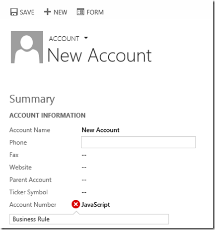 I've created 2 Business Rules. The first shows an error message when the Account Number field equals 123456. The second sets the Account Number field value when the Account Name equals "New Account".